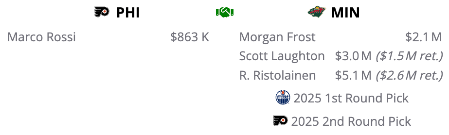 This is a very “quantity over quality” approach from the Flyers. They retain half of Laughton’s deal for one year, and half of Ristolainen’s money for two more seasons to make the trade more attractive to Minnesota, who could use the savings to re-sign Frost. Edmonton is currently the worst of the Flyers’ three first round picks.