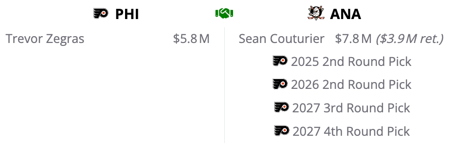 The cocktail of draft picks individually don’t represent much, but in total could be used better via trade then dumping them on Zegras. If Anaheim were eating all of Couturier’s money, then the draft picks are fine. But with the retention, the Flyers should save one of those two second rounders.