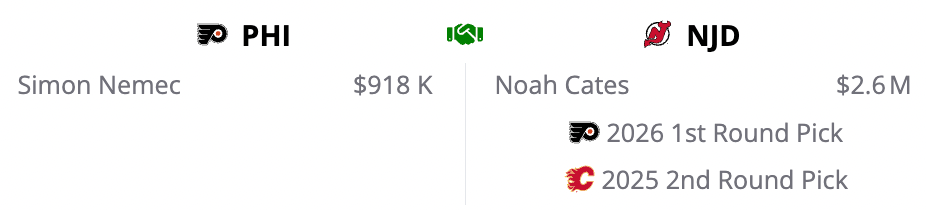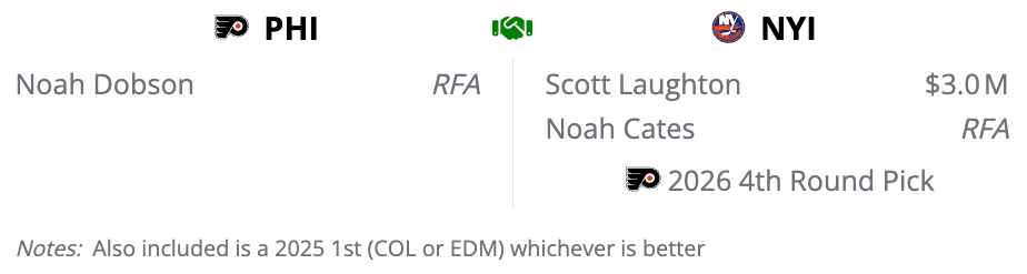 The Isles add to their collection of aging relics on the roster with the addition of Laughton, and they can keep up their boring two-way gimmick with Noah Cates. They also land one of the Flyers’ 2025 first round picks, whichever pick ends up being the middle of their three selections.