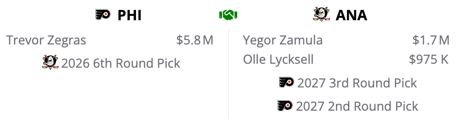 This trade seems to indicate that Zegras’ trade value has fallen from grace quite a bit from what it was this time last year. Adding Zegras at a rehab project cost is certainly more enticing that paying through the nose to do so. The soon-to-be 24-year-old has one year left on his contract at a $5.7 million cap hit.
