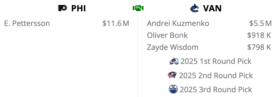 There’s a lot of noise here, but the reality is there’s only two things from the Flyers’ side that are worth much- being Bonk and the 2025 1st, maybe the 2025 second if you want to be picky. Kuzmenko is a pending UFA and unlikely to re-sign in Philly, Wisdom is a pending RFA who probably won’t make the NHL, and the third rounder is deep in crapshoot territory (which they don’t technically own, it was acquired in a separate trade from the author’s proposals.)