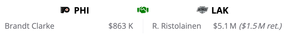 This should be a gimme. The Flyers get a 22-year-old talented right-handed defenseman in exchange for their 30-year-old vet Rasmus Ristolainen. The Flyers retain $1.5 for two more seasons, but considering Clarke still has one year left on his entry-level contract, the monetary side still favors the Flyers.