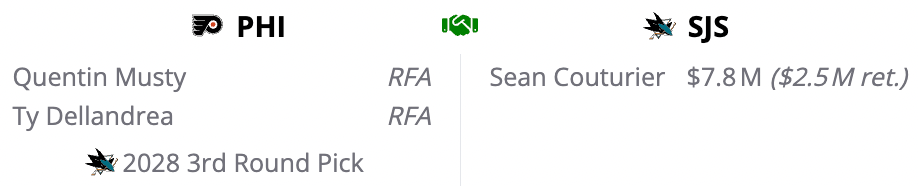 To be fair, I have no idea why San Jose would do this. Adding a still-expensive elderly Sean Couturier and giving up their 2023 first round pick Quentin Musty for the pleasure of doing so is something that NHL25 would laugh at, let alone offering it to a real sports organization.