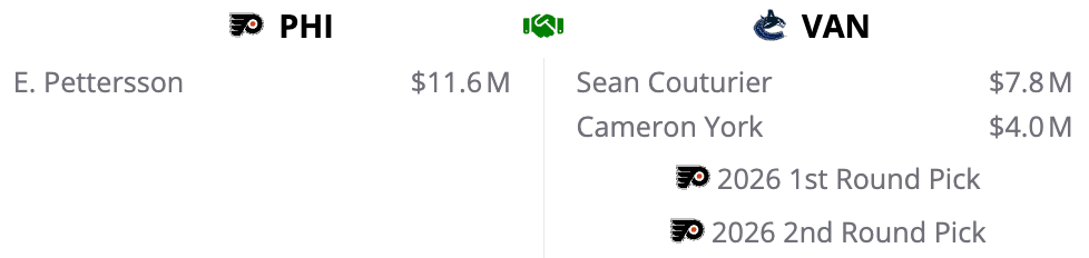 The Canucks get something equivalent to a warm body at center in Sean Couturier, who still has five years left on his contract. They also land left-handed defenseman Cam York, who could be on the outs in Philly after some off-ice issues with the coaching staff.