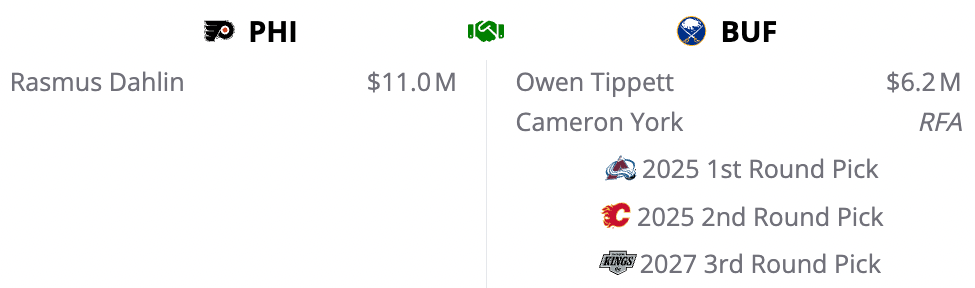 The Flyers move on from Owen Tippett before his trade protection kicks in, and send York to Bufflo, which may be a worse fate than he thought playing for Tortorella was. Philly uses some of their abundance of draft picks to snag a much needed bonafide top defenseman.