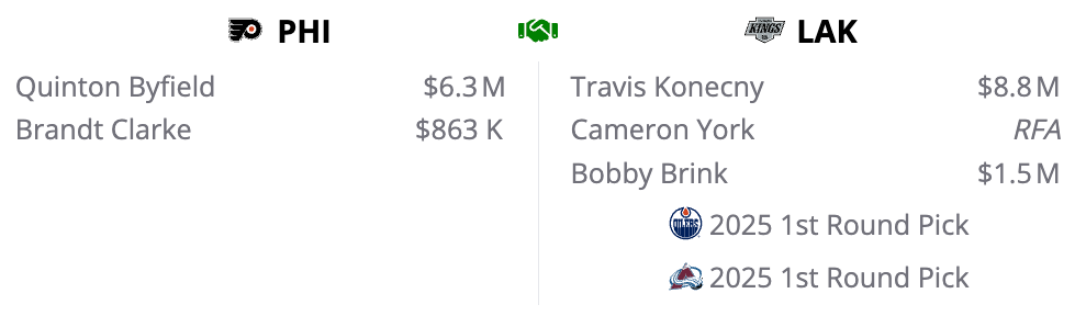 The Flyers could be having second thoughts about extending Konecny a year early, and they could deal him before his full no-movement clause kicks in this summer. The Kings finally hunt down that top winger the wanted back at the trade deadline. And LA also gets a decent replacement on their blue line (even though York is a lefty and Clarke is a righty), plus two first round picks as ammo to continue to build into a real contender.