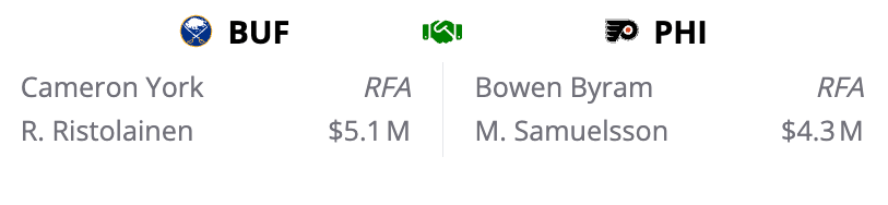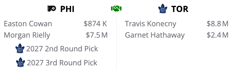 Very rarely have we featured a trade with so many layers. The Flyers get their LHD replacement and a top forward prospect and the Leafs get to continue their push towards physicality as their solution for playoff struggles. The draft picks feel like overkill in this scenario, but hey, the Flyers could always use more draft fodder in upcoming seasons.