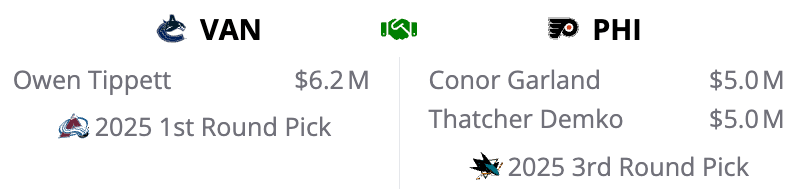 This feels like one of those trades where Patrik Allvin would piss himself laughing if Briere actually proposed it, but the Flyers circling around Rick Tocchet’s favorite pieces from his former team makes sense, and they need to heavily consider ditching Owen Tippett. But to play devil’s advocate, both of the Canucks’ players are UFAs next summer and if they’re going to retool, getting a forward with term and a first round pick for two pieces thay’ll just move on from anyway could make sense. However, they’re probably worth more individually at the trade deadline than in this scenario.