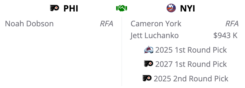 There’s a good chance the knee jerk reaction from Flyers’ fans is going to be strong with this one with Luchanko involved, but the logic of the trade itself isn’t necessarily bad. If they’re getting rid of York, they need a serious upgrade on defense, and Dobson is probably their best option in 2025.