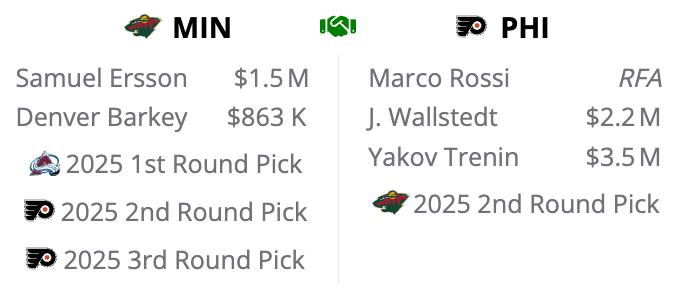 The theory on this trade isn’t that bad. The Stars are looking to ditch some cap space, so the Flyers take on the two years at $3.3 million of 31-year-old defenseman Ilya Lyubushkin and the one remaining year of 30-year-old Matt Dumba’s $3.8 million contract.