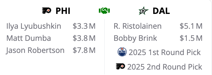 The trade gets centered around Robertson, whom the Flyers pay a reduced price tag of their own assets because they ate both contracts Dallas was trying to get rid of.