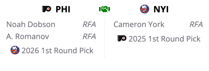 The Flyers would surrender the sixth overall pick, giving the Islanders both first and sixth overall, and the Isles would get a replacement right away for Romanov in York.