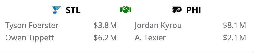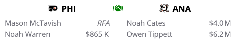 They just re-signed Noah Cates to a very reasonable 4×4 contract, but the reality is his ceiling is still likely pretty low. Adding McTavish (22 years old, 140 points in 229 games) gives you a center with much higher upside, plus the Flyers ditch the remaining seven years on Tippett’s $6.2 mil aav contract.