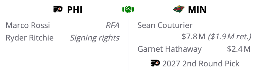 The Flyers mercifully move the remaining five years of Sean Couturier (retaining $1.9 mil to make it happen) and also move veteran depth winger Garnet Hathaway who has two years left on his current contract.